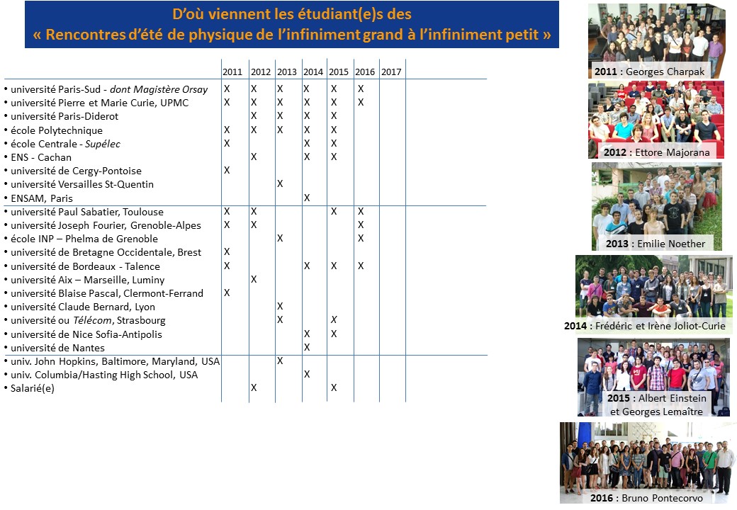 Aussi pour tous les étudiants, venir à ces Rencontres c’est découvrir d’une façon originale et motivante cette physique des infinis et revenir en septembre en M1 (ou 2ème année d’école d’ingénieur) encore plus motivé et boosté pour la suite de ses études !