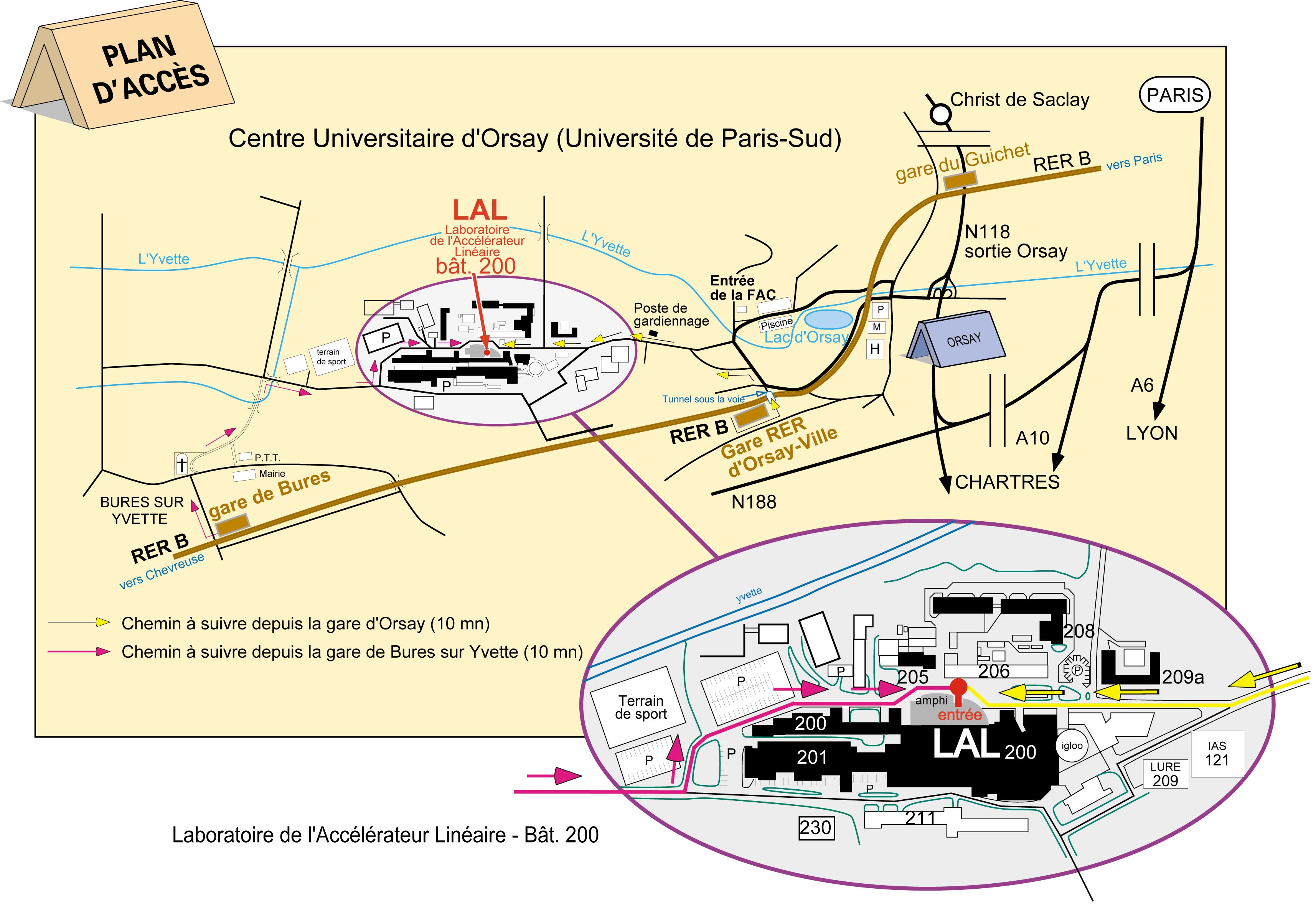 Pour trouver cet amphi le premier jour, vous pouvez regarder ce plan qui vous indiquera le chemin jusqu’au b.200 de l’IJCLab. Il vous faut descendre soit à la gare de RER-B d’Orsay soit à celle de Bures-sur-Yvette. Un plan du réseau est disponible sur le site de la RATP.