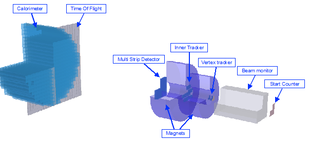 Figure 1: Setup of FOOT experiment including the start counter, the beam monitor, the vertex tracker, the inner tracker, the multi strip detector, the time of flight and the calorimeter. The magnetic field is induced by two permanent magnets.