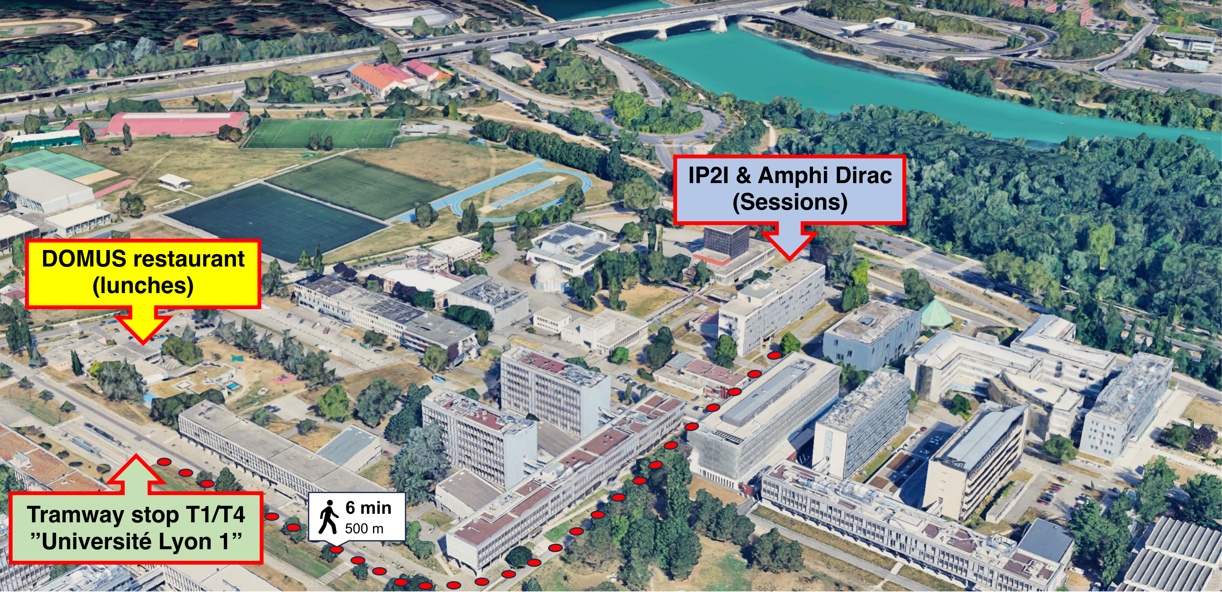 How to reach the IP2I (workshop venue, see top of the page): from "Part-Dieu", take the tram T1 direction "IUT Feyssine" or T4 direction "La Doua Gaston Berger" and get off at the stop "Université Lyon 1".