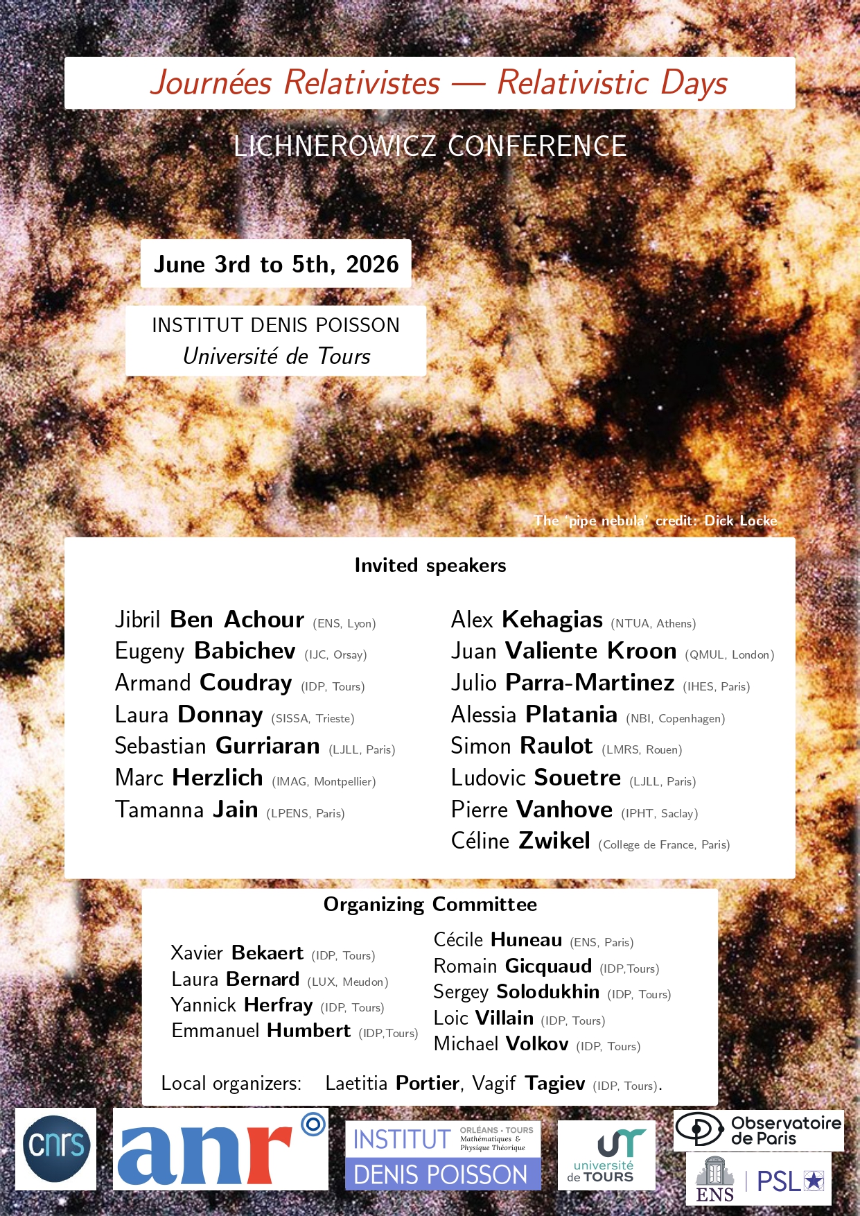 This conference is part of a series alternating between Tours and Paris, of which two events have already taken place: the first edition was organized at the Denis Poisson Institute (Tours, 2023) https://indico.in2p3.fr/event/29640 and the second edition at the Henri Poincaré Institute (Paris, 2025) https://philippelefloch.org/2025/05/22/lichnerowicz-conference-ihp-11-13-june-2025.