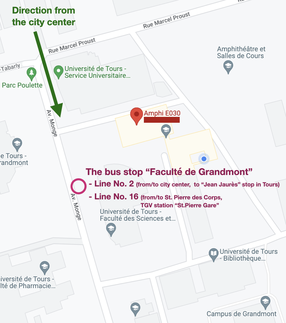 From Tours railway station, take rue de Bordeaux (semi-pedestrian) to reach Place Jean Jaurès. From there, take line 2 towards “CHU Trousseau.” Other lines (3A, 3B, 14) also stop at the science faculty but are less efficient. From Saint-Pierre-des-Corps station, take line 16 towards “Joué les Tours, Blotterie.” In any case, get off at the “Faculté de Grandmont” stop located on Avenue Monge. For timetables and lines, consult the website Fil Bleu.