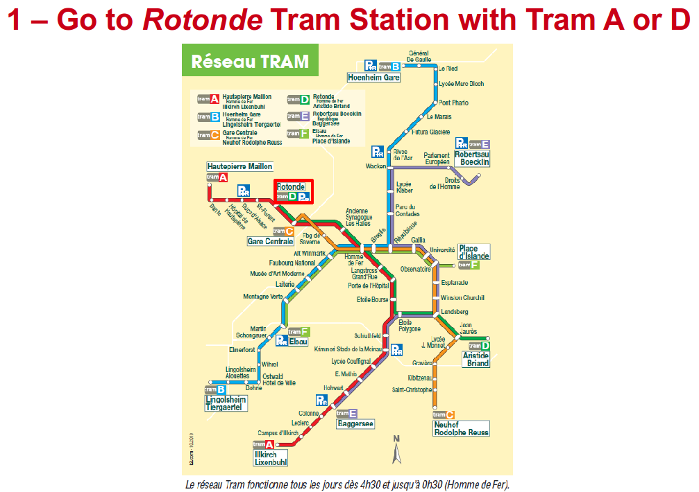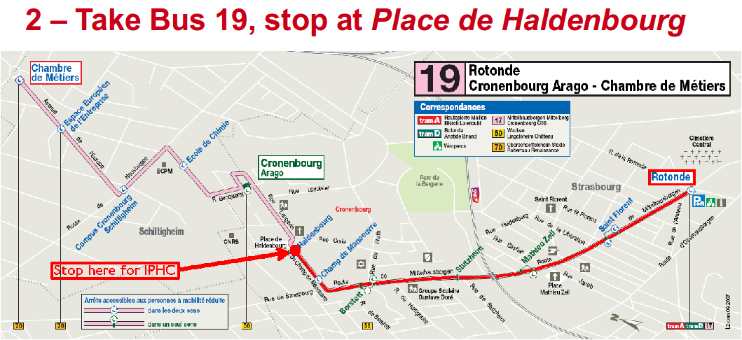 CAUTION : On Wednesday and Friday, because of the Market on the Place de Haldenbourg, the Bus takes a different route! See here for the map