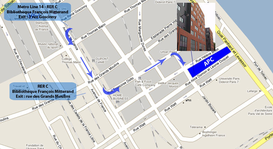 From Charles de Gaulle Airport : take RER B « Paris by train » to the station « Saint-Michel Notre-Dame », then take RER C to « Bibliothèque François Mitterrand » (get on the front of the train). Take the « south » exit (Grands Moulins). The cost of one way ticket from CDG is 9,50€. The travel takes around one hour.